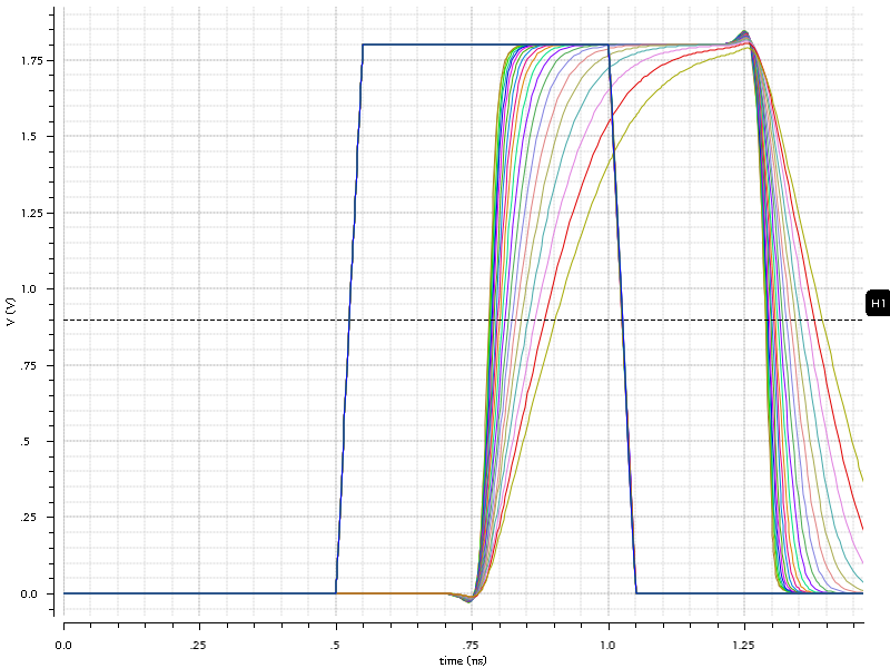 The output capacitance was varied between 1 pF and 30 pF in increments of 1 pF. The plot below shows the input signal, and the output signals corresponding to different output capacitances. The higher the output capacitance, the less squared the shape of the output signal is, and more delay can be observed using the mid-point rule.