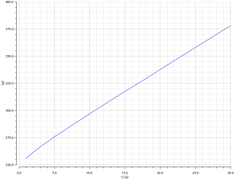 So we can see that at around 30 pF output capacitance, the delay will be around 375 ps, not that bad for such a huge capacitance.
