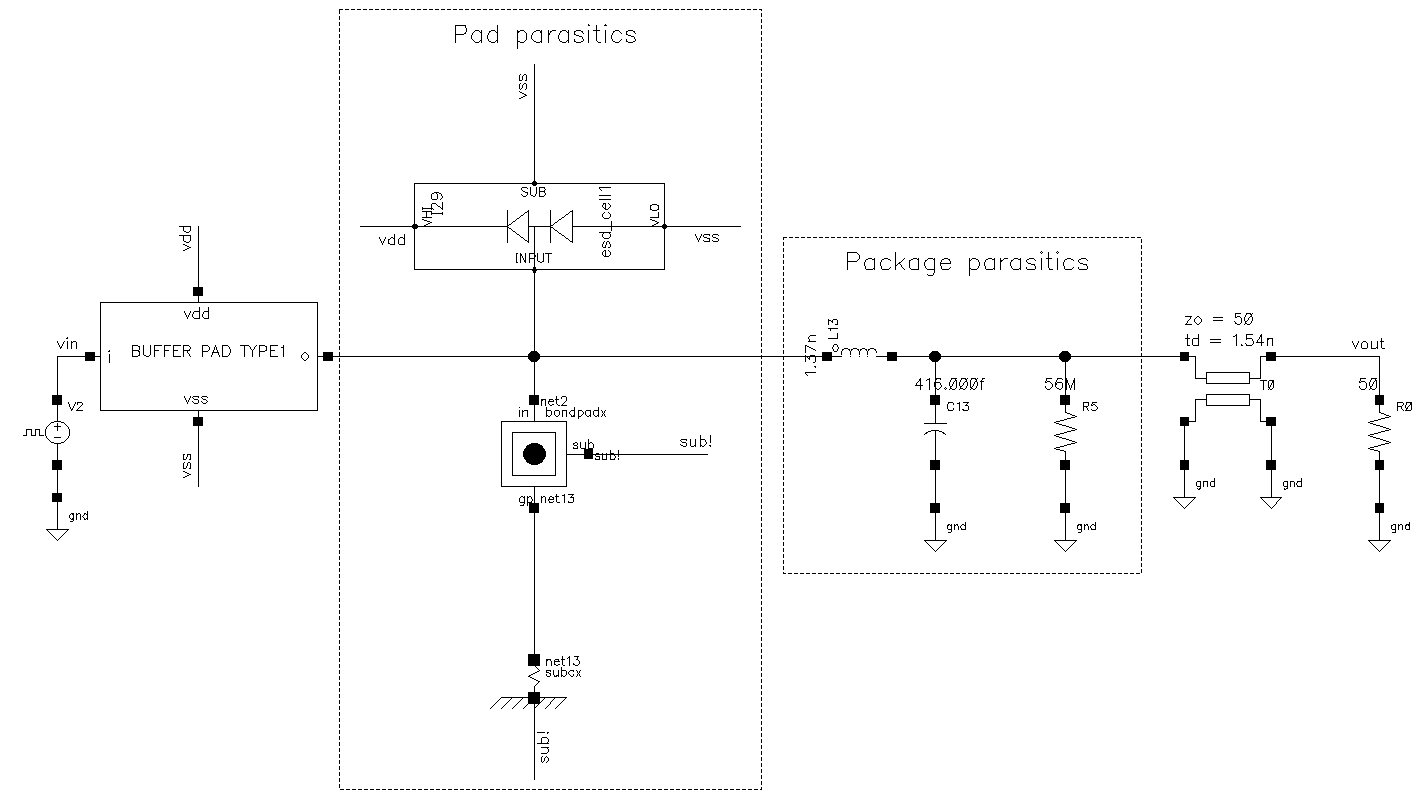 Next the buffer was simulated with the added ESD cell and PAD parasitics at the output, rough parasitic model of package and ideal transmission line with 50 Ohm impedance. The testbench setup is shown below