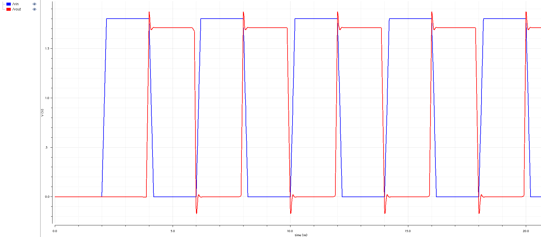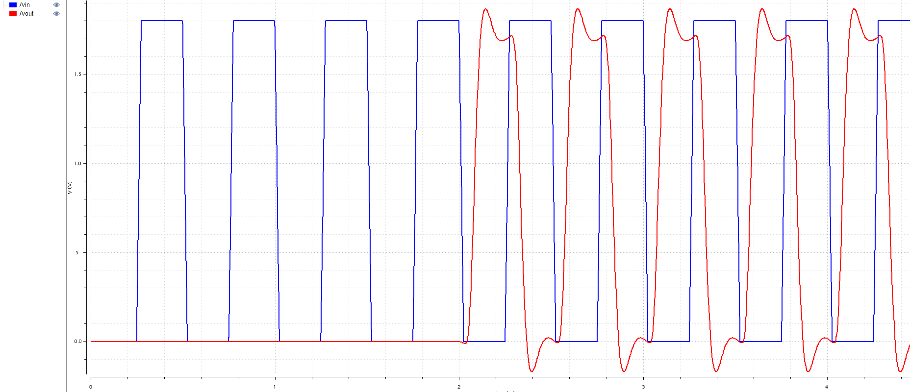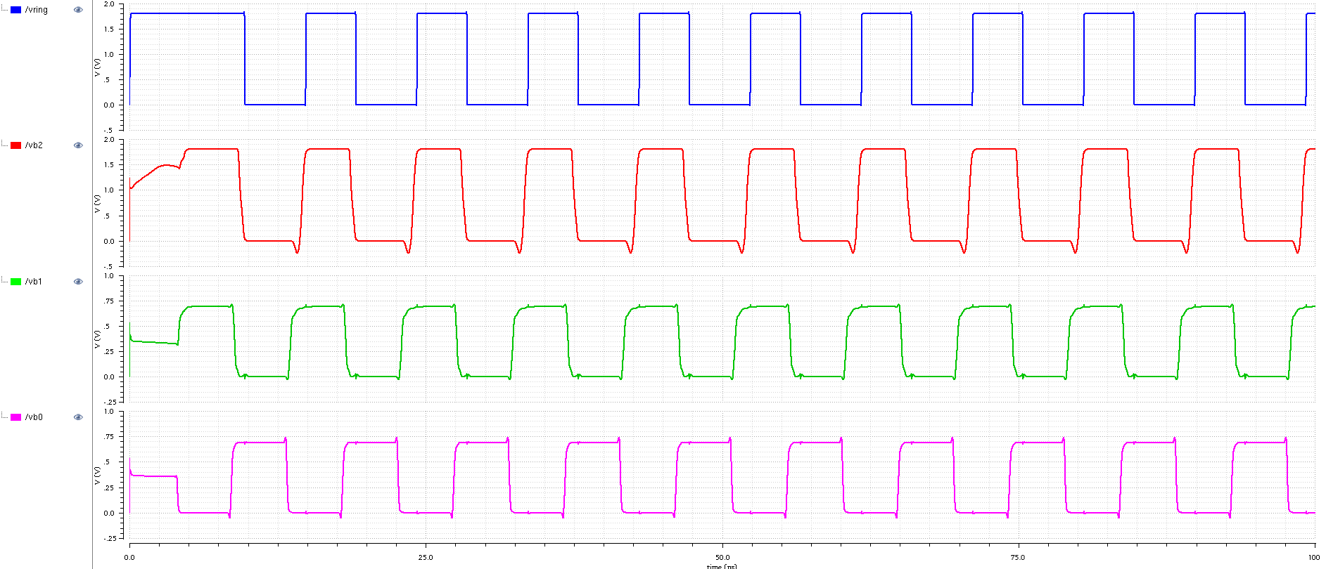 The voltage of around 0.69V was provided to the ring oscillator, the output signal coming from it designated as vb0 has 0.69V level as well. Then it is being inverted as shown on vb1 waveform, after that its level is shifted to 1.8V as shown on vb2 waveform. Finally, it is passing a digital buffer which removed the undershoot, improved the rise/fall times and incereased strength of the signal. You can click on the simulation waveform picture to enlarge it in new window.