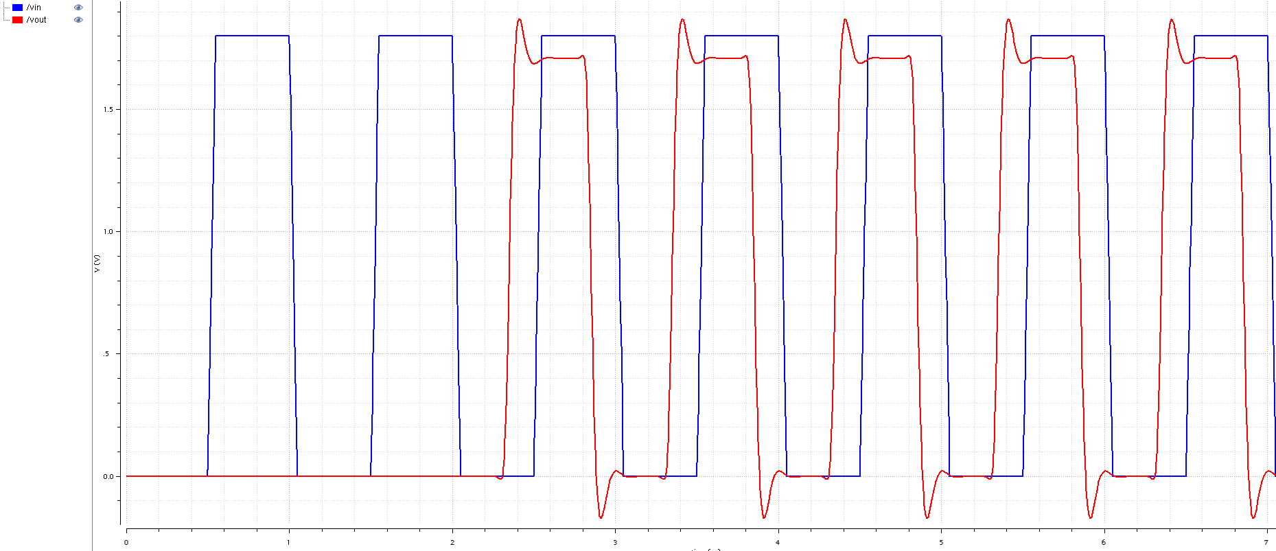 Red: vb is at 0V, Green: vb is at 0.9V, Blue: vb is at 1.8V. If we take a ratio of output to input capacitance at bias voltages of 0V and 1.8V we can see that they are almost close to 1, a value which is supposed to be an electrical and logical effort of a unit inverter. At this stage I can also assume the unit capacitance C to be around 2.7 fF.