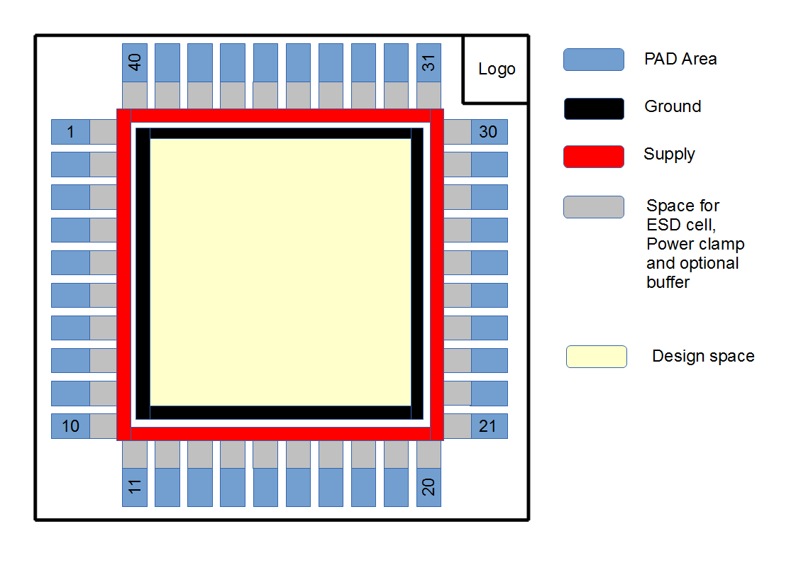 It is important to have a nice, convenient and properly designed PAD Frame for the chips. Depending on the design of course they can be different. The total area of the chip I decided to use is 1.5mm x 1.5mm. For most of my tests designs under this process around 1mm x 1mm area is enough for my designs. The rest of the chip space is used by PAD frame, power supply rings, ESD cells, Power Clamps, Buffers, etc. As well as some hot looking logos. It's really important to have an awesome logos or the chips don't seem to be legit.