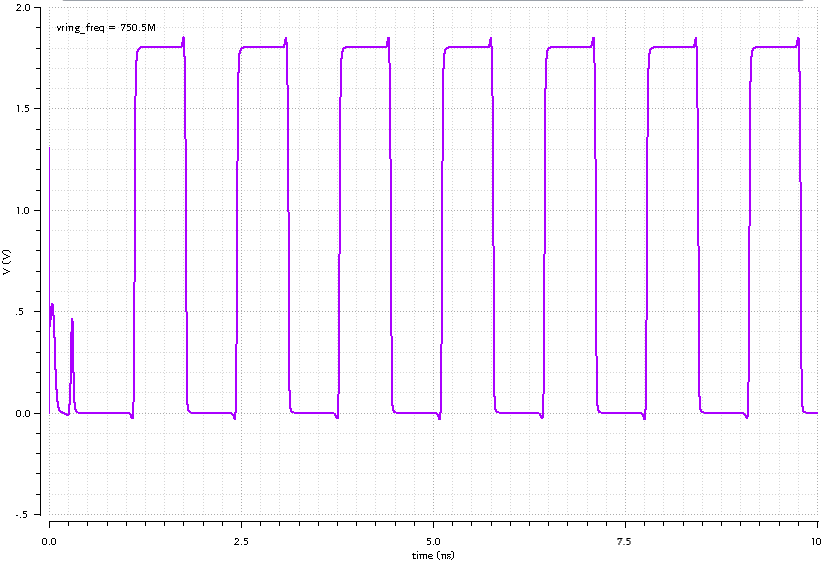 The 31-stage Ring Oscillator was connected to 1.8V voltage source. The normal corner was selected for simulation. The frequency of simulation was observed to be 750.5 MHz compared to the 626 Mhz computed frequency using the result of simulation of inverter delay. The transient plot is shown below