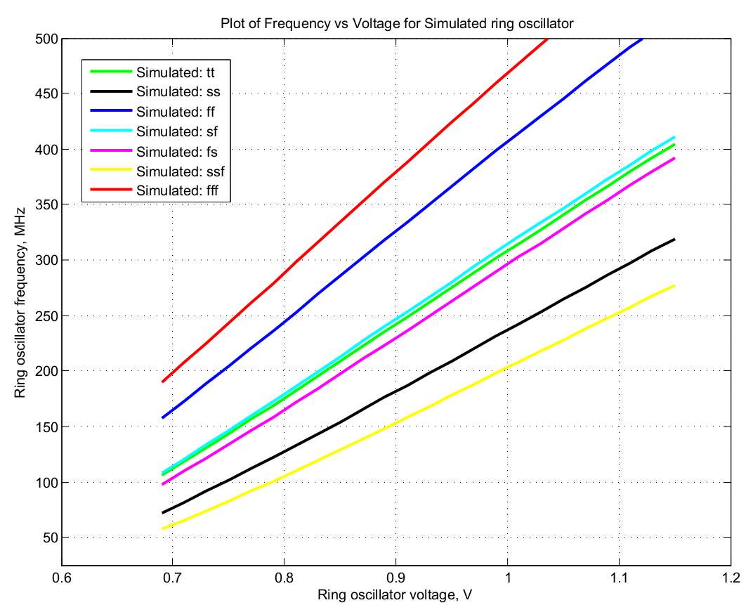 Initially I planned to use my HP 54510A scope with 250 MHz bandwidth and 1 GSPS sampling rate. So I performed the simulation of the variable ring oscillator in which the supply voltage was varied so that maximum frequency of 250 MHz is obtained with slowest corner. The simulation plot is shown below