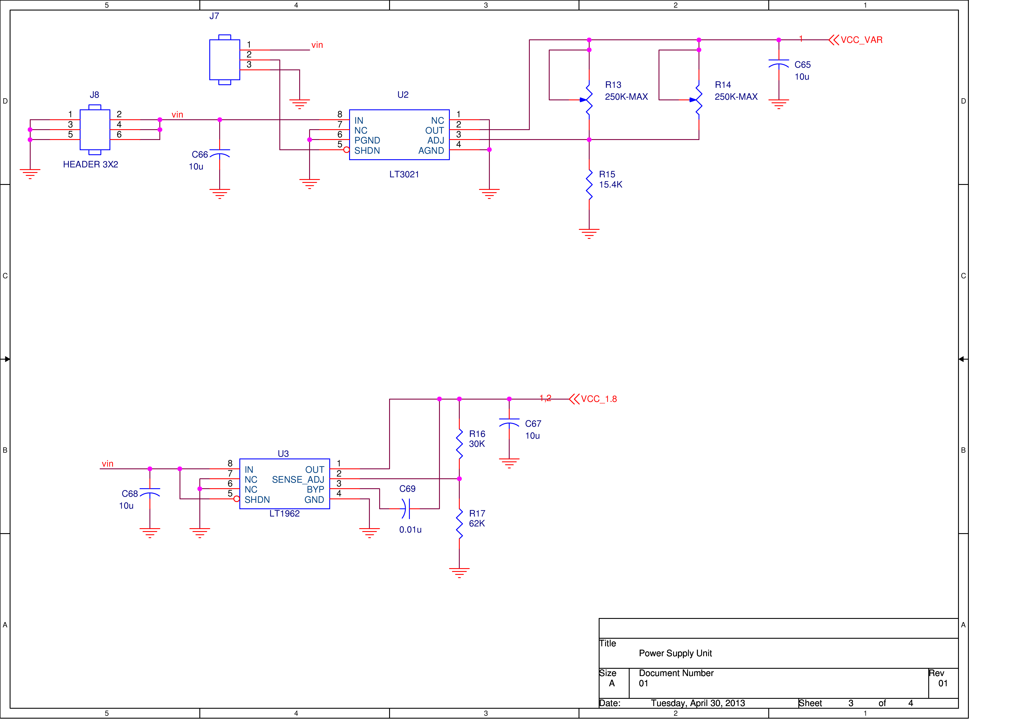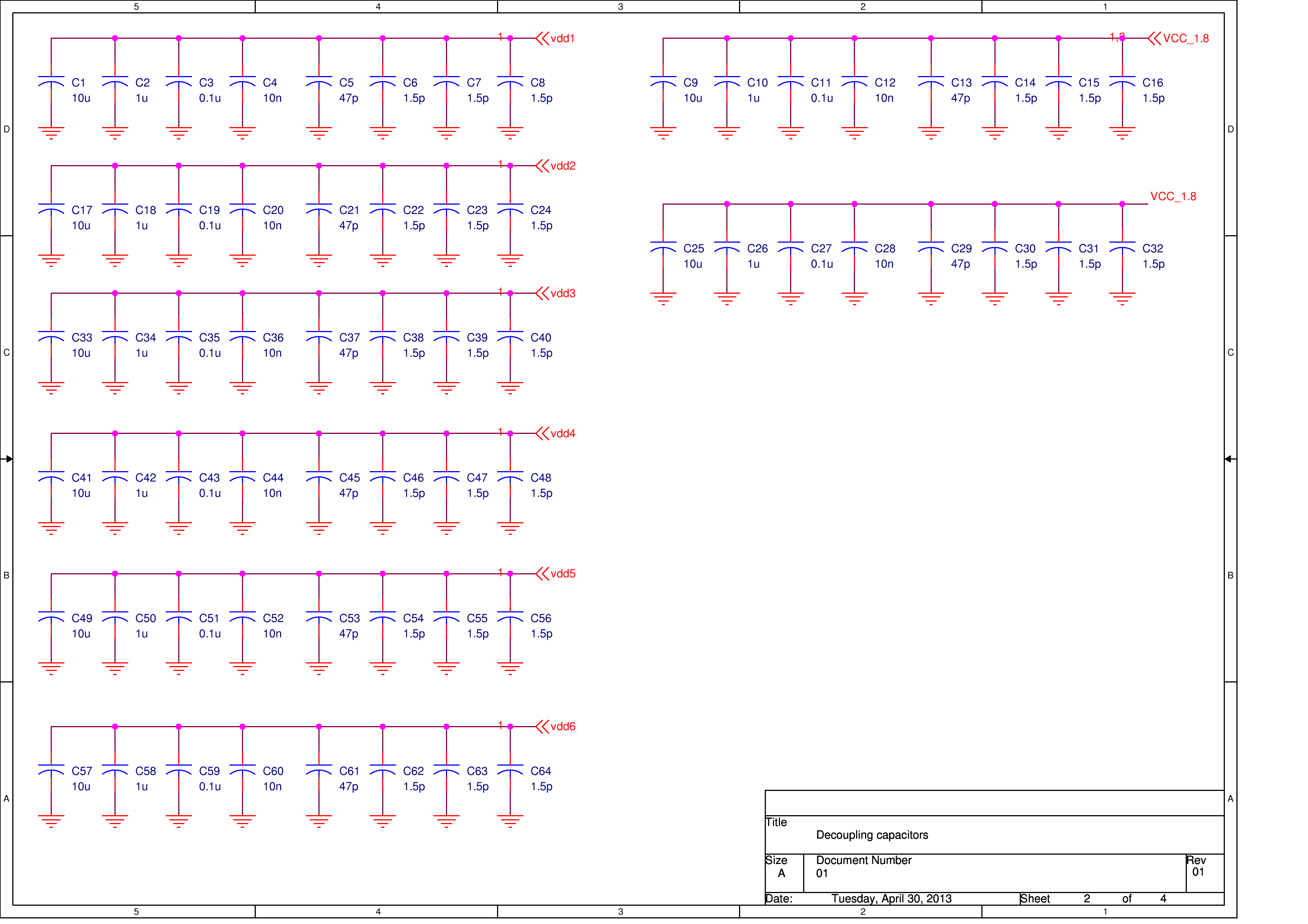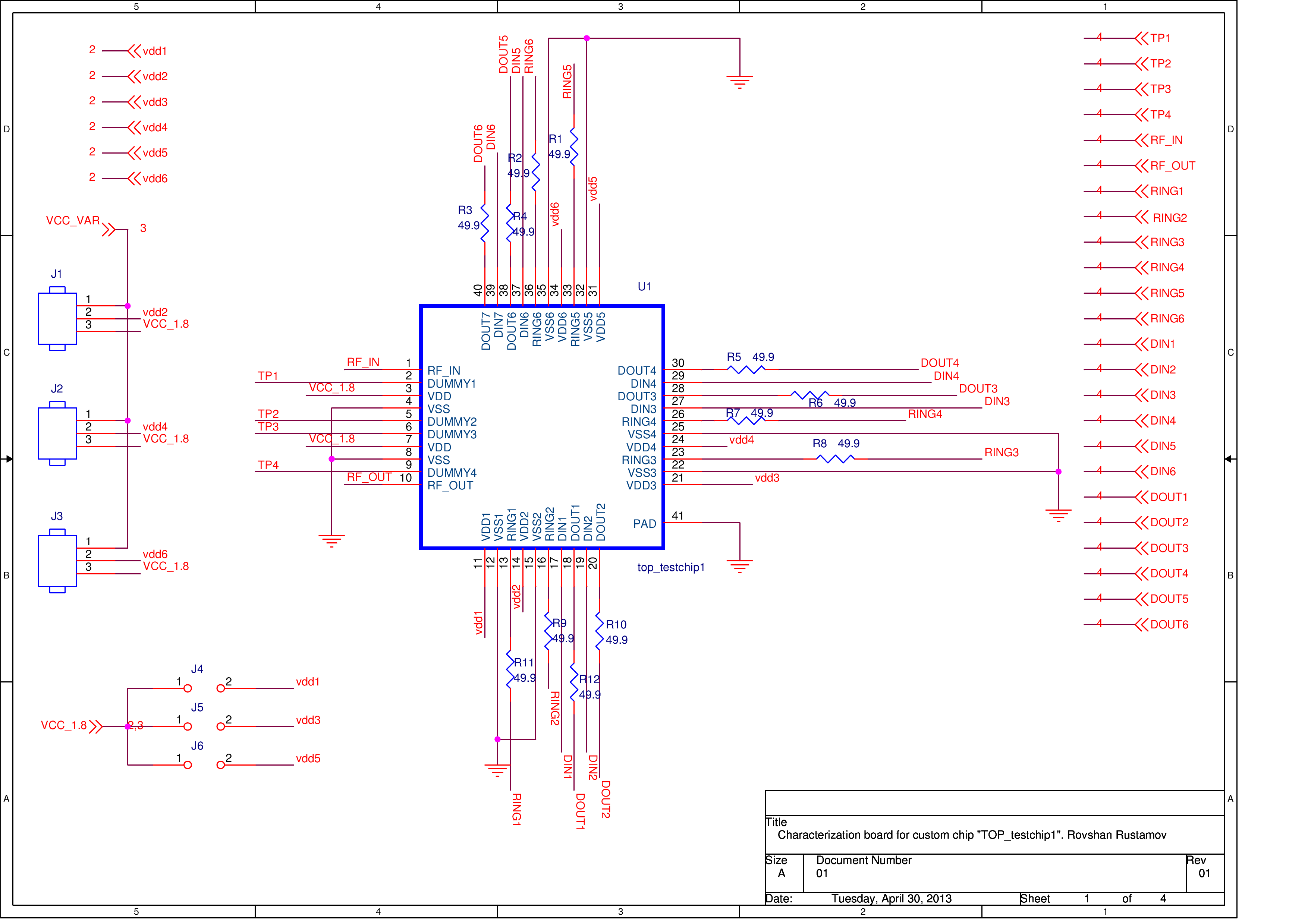 The schematics of the test PCB are below. I have total of 6 Ring Oscillators, 3 of them have fixed voltage supply, another 3 variable voltage supply.