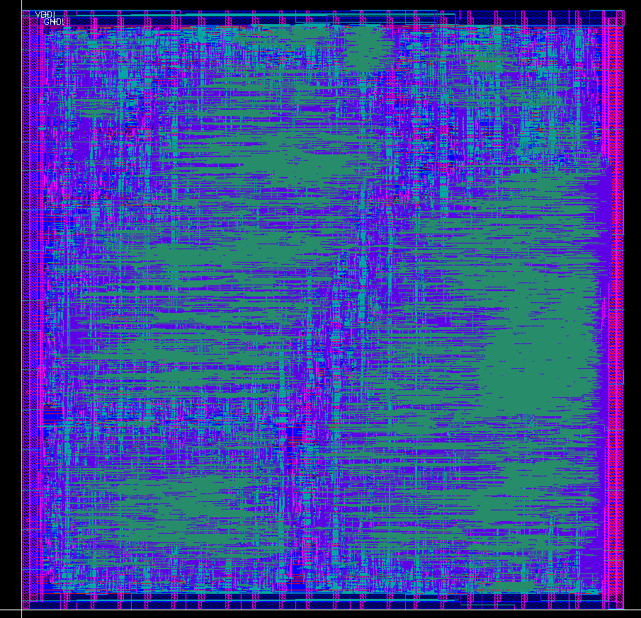The standard cells are aligned as horizontal rows with the horizonal power lines running from one side of the frame to another. There are also 10um wide power and ground vertical lines repeating every 100um, they can be seen on top and bottom parts of the design in pink color, they are implemented on M2 level metal.The maximum routing layer is M5. Total size of design is roughly 2200um x 2200um. The design also has an amoeba clock tree and was tweaked to meet the timing at 100 MHz main clock.