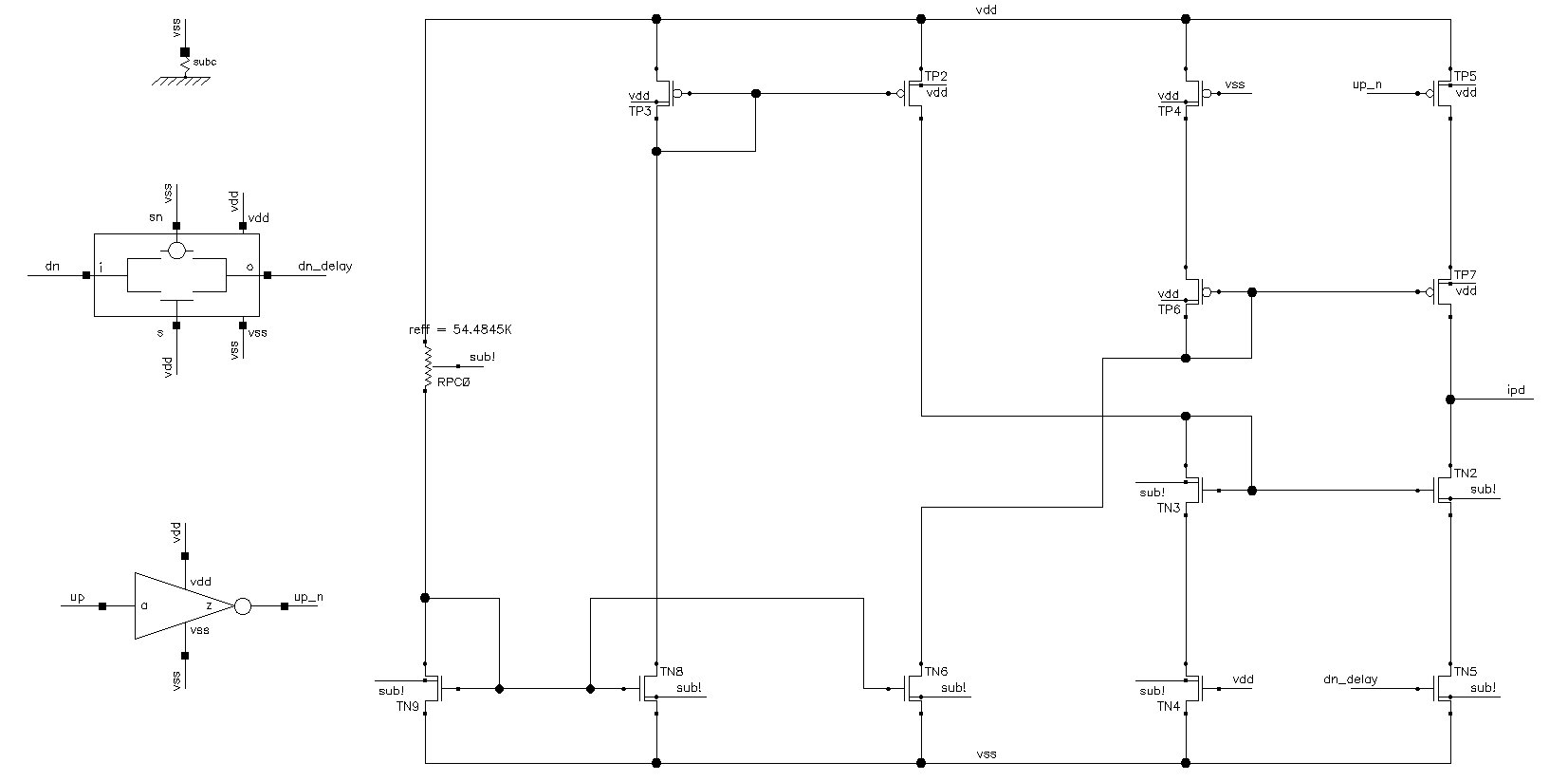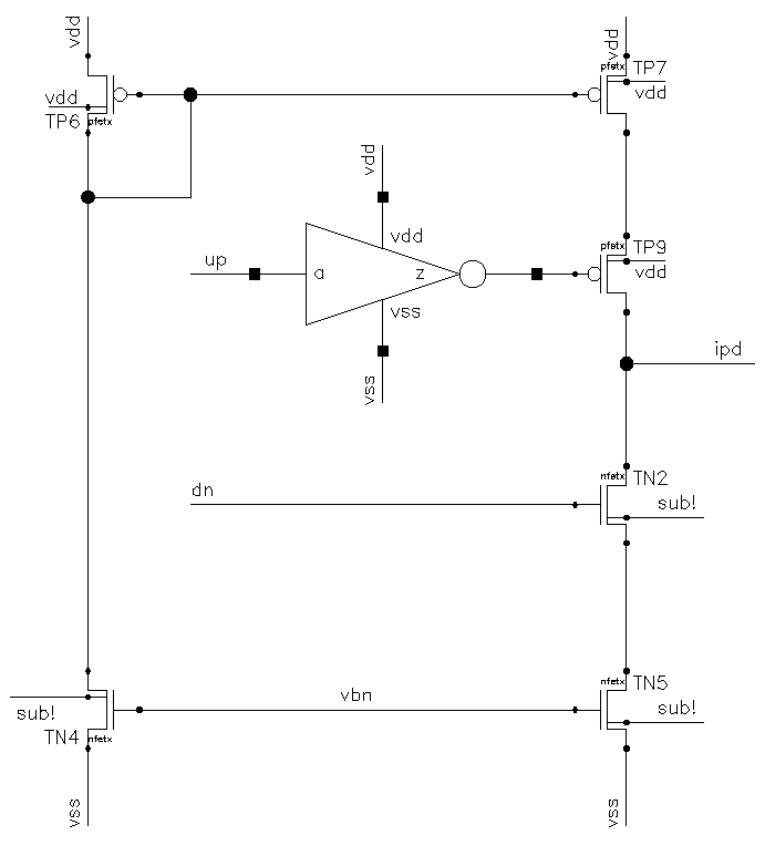 The switch transistors TP5 and TN5 are now connected to the node ipd through the mirror transistors TP7 and TN2 . This way the effects of the charge sharing are significantly minimized. The enabled transmission gate was also added to equalise the inverter delay. The transistor sizing and the design was based on the following calculations