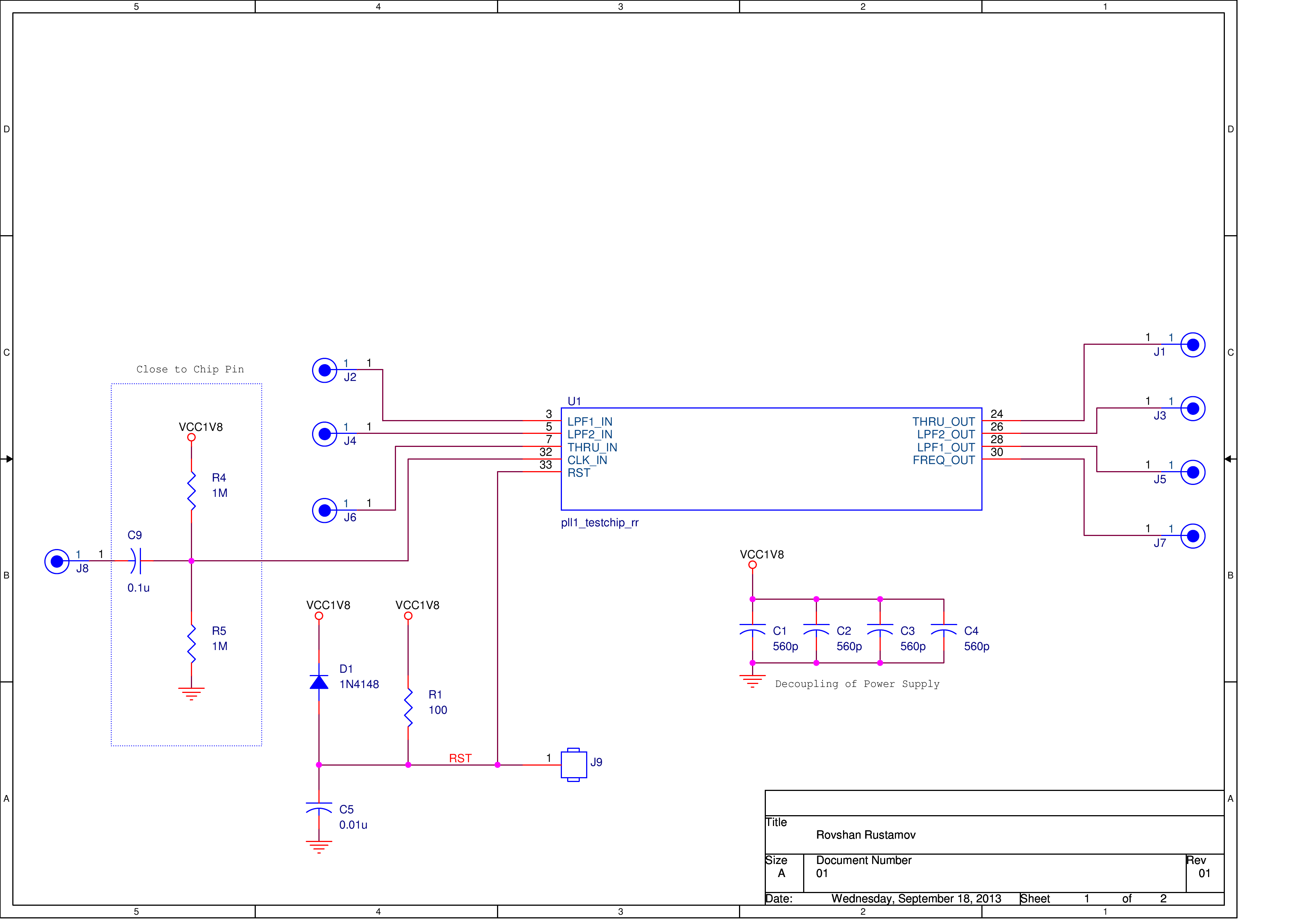 The test PCB schematics are shown below. The decoupling capacitors C1,C2,C3,C4 were selected so that to kill the 200 MHz input signal ringing into the supply line. The D1,C5 and R1 are forming the delay for the RST pin of DPLL. The C9,R4 and R5 are used for DC shifting the input sinusoid from signal generator which is centered at 0V.