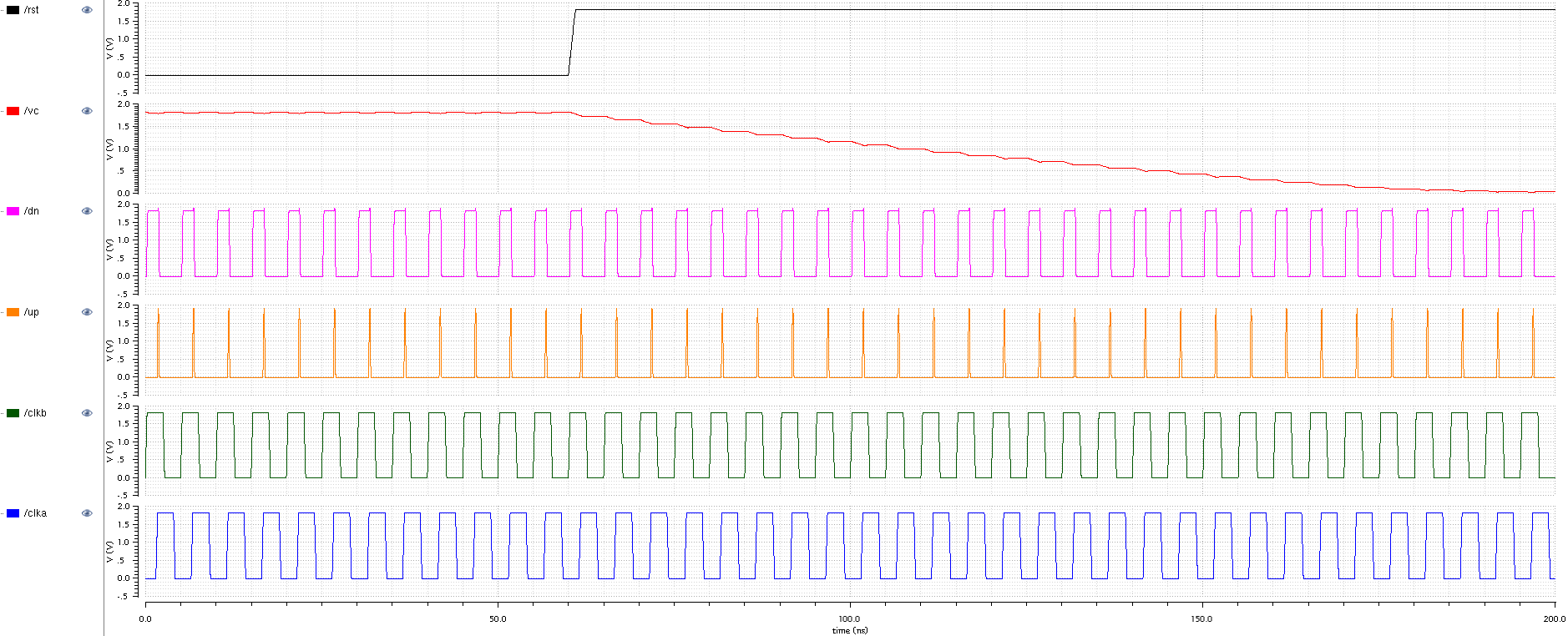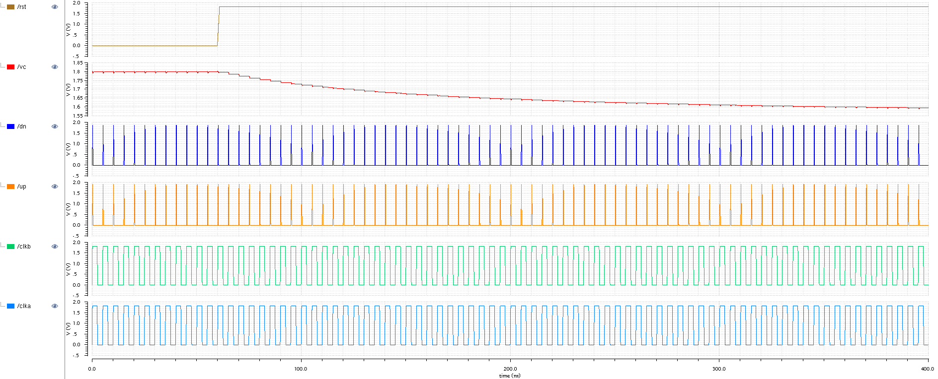 Now I connect back the reset transistor, and set now clka to be delayed by 1.5 ns. As a result, we see the voltage at the vc node going down and the DN pulse is now wider than UP pulse.