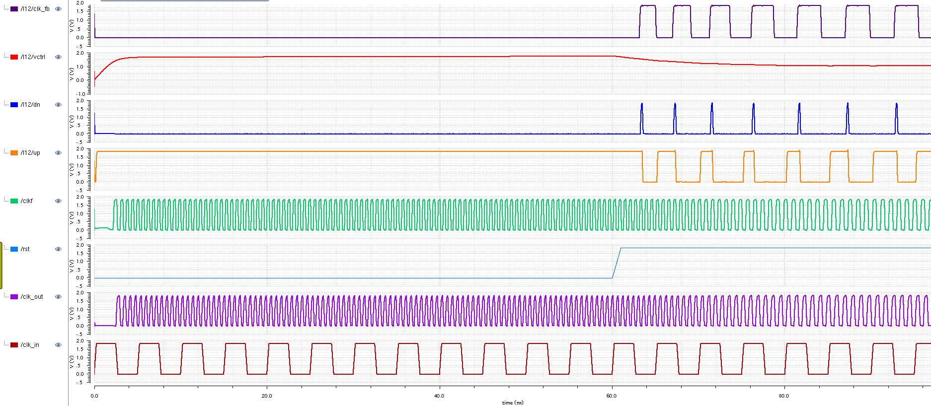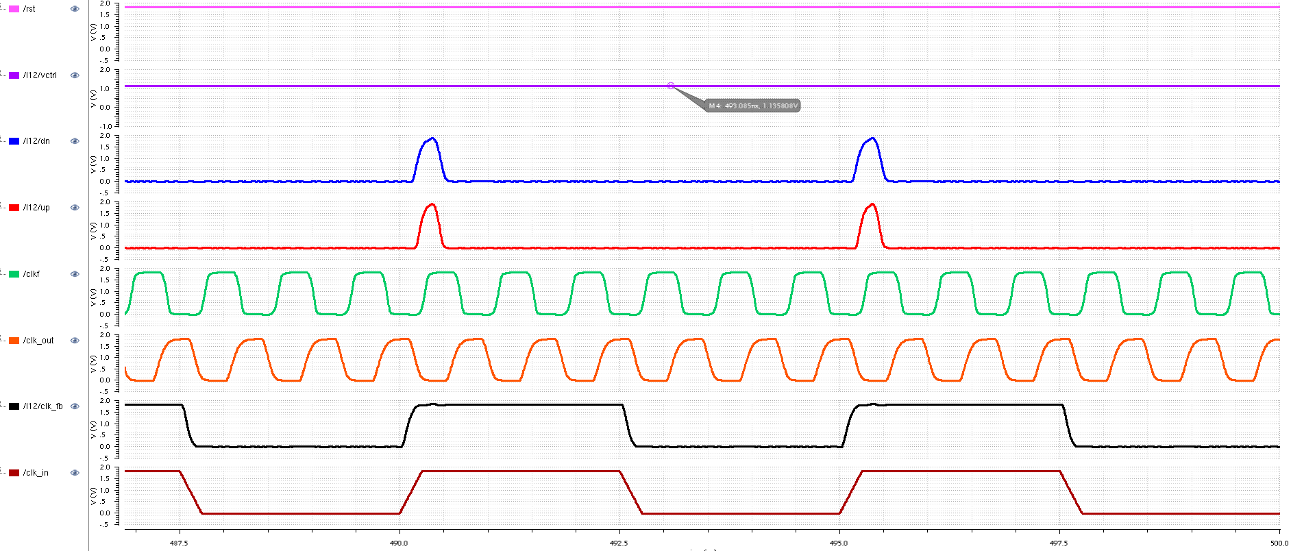 Here is a zoomed last 24 ns of simulation. The control voltage vctrl is settled to 1.135V the output clock signal clk_out has nice sharp edges given the 15 pF output load capacitance and a 50% duty cycle. The clk_in and clk_fb are nicely aligned in phase. So the DPLL seems to be working.