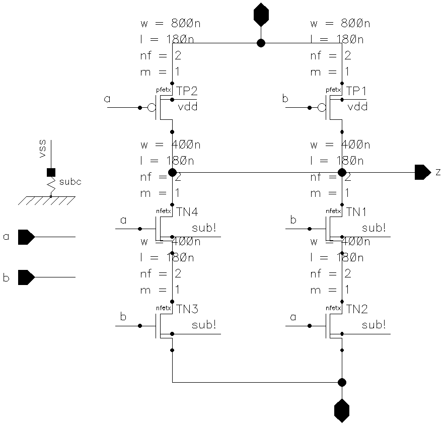The important things to note here is that NAND2 gate must be symmetrical, fast and with equal rising and falling edges. That is why both if its inputs must have same parasitic capacitance. Below is the schematics of a NAND2 gate used in this design