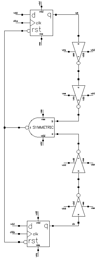 I implemented the PFD with two typical two-latch design flip-flops with asynchronous active-low reset and symmetric two-input NAND gate. The schematic is shown below